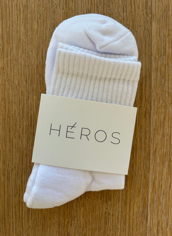 Translation missing: en.products.product.regular_price $18White crew length ribbed sock in ultra-soft combed cotton with black embroidered HÉROS logo. Double cushioned sole for maximum comfort. An everyday sock, made for all workouts and off-duty moments.